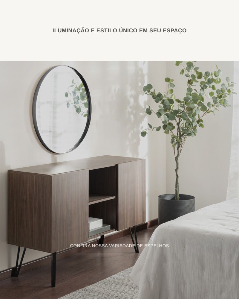 O espelho é leve, fácil de instalar e tem uma presença incrível no ambiente. O reflexo é limpo e o formato orgânico é apaixonante.
